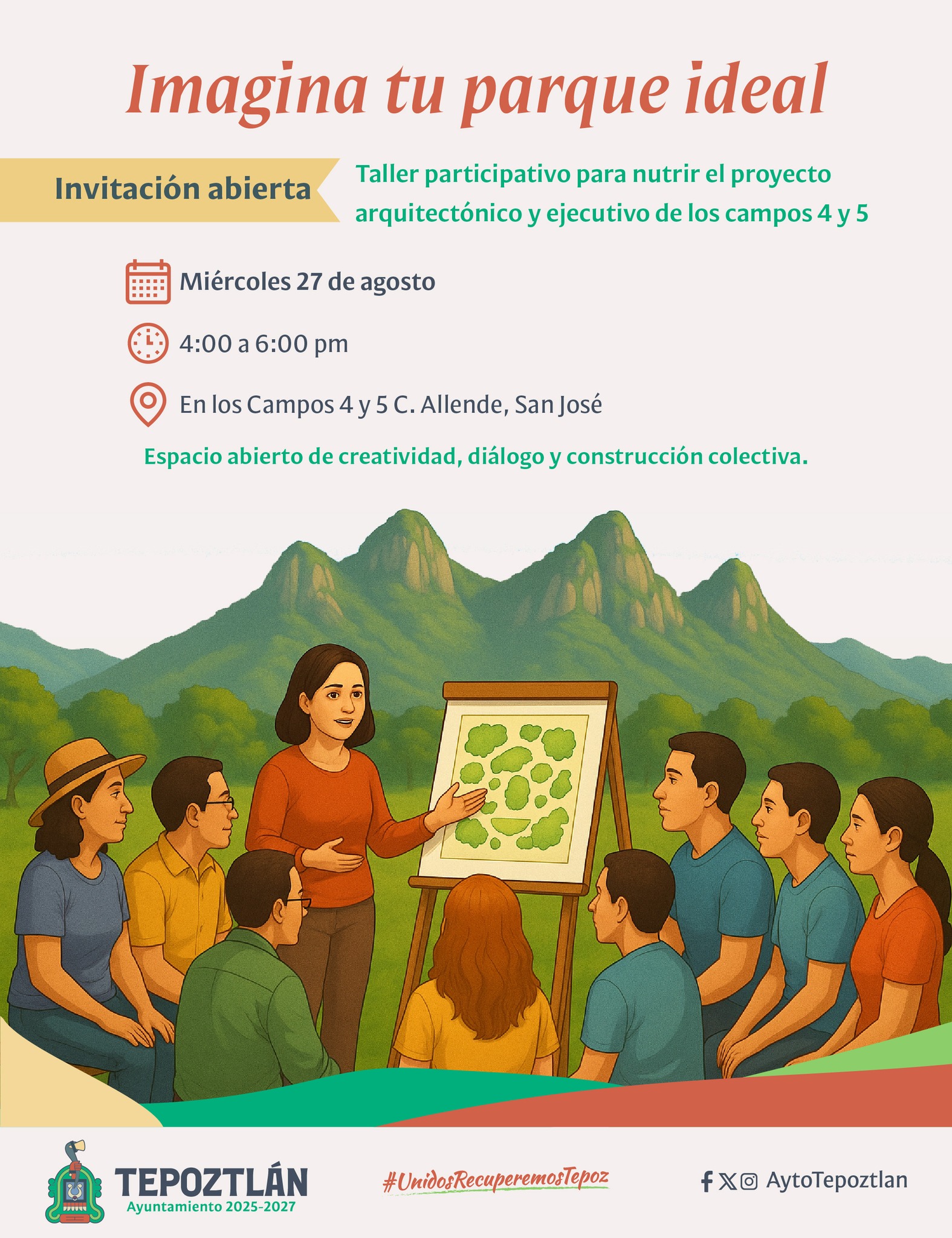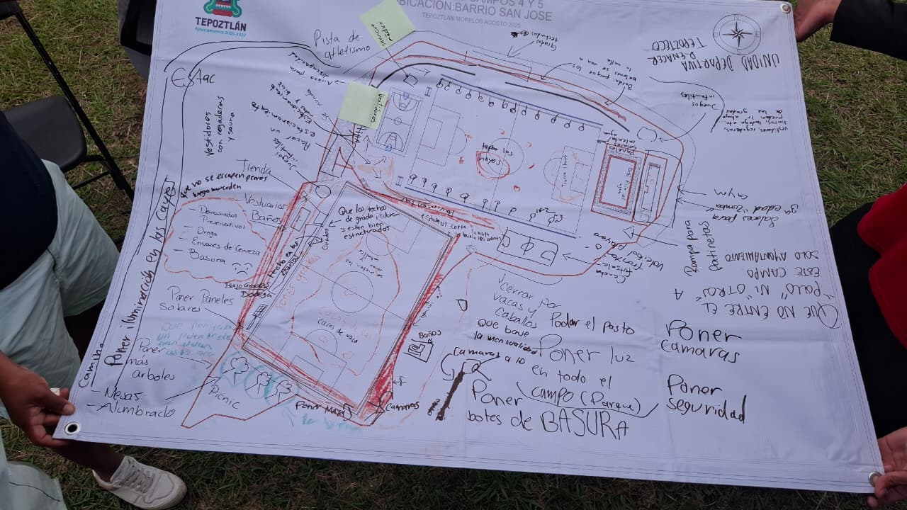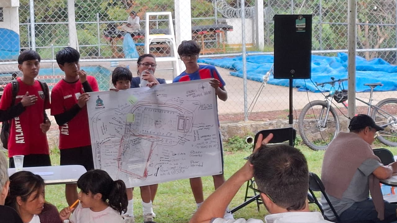 Con la meta de transformar y dignificar sus espacios públicos, la Aceleradora de Ciudades y el municipio de Tepoztlán llevaron a cabo el Taller de Diseño Participativo “Diseña tu Parque Ideal”. El evento reunió a la comunidad para co-crear el proyecto de regeneración de uno de los centros deportivos más importantes de la ciudad: Los Campos San José 4 y 5.